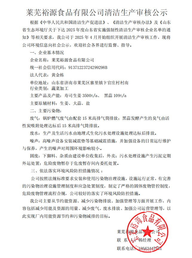 萊蕪裕源食品有限公司清潔生產(chǎn)審核公示